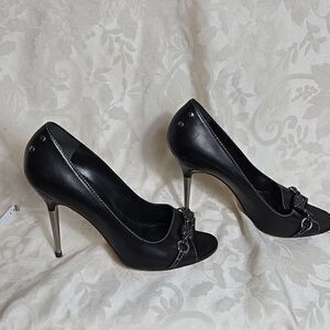 Manolo Blahnik Black Leather Open Peep Toe Silver Metal Heel Shoes Heels