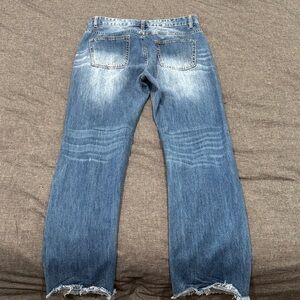 Stylish straight jeans featuring unique patchwork designs. Perfect for casual outings. 15 inch waist. 29 inch inseam.
