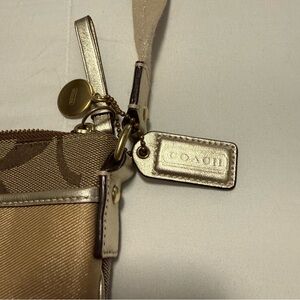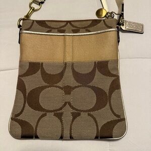 Coach Signature Crossbody Bag Tan Brown Canvas Gold Leather Trim 7.5 x 8.5 Bag