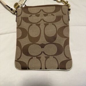 Classic and timeless Coach signature crossbody bag in tan and brown jacquard canvas with leather trim. This is the perfect everyday size for essentials and works great for travel, errands, or hands-free wear. The neutral colorway goes with everything, and the iconic Coach “C” pattern never goes out of style.