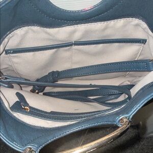 Chic navy tote with pink floral accents. Features elegant gold ring handles. Perfect for versatile styling.