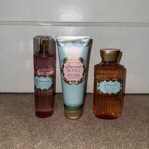 Bath and Body Works Sweetest Song Collection, comes with all 3 products as shown, all new have never been used, full sized 10 and 8 fl oz, fragrance notes: blush raspberries, sugar crystals, whipped musk