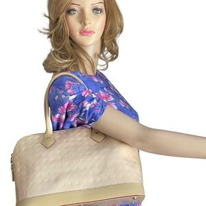 Chic Arcadia satchel in beige. Embossed design with sturdy handles. Ideal for stylish outings.