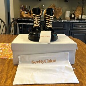 Florrie Rain Boot By See By Chloé. Featuring: -front Lace Up Fastening -firrst 3 Eyelets In Gold-toned Galvanised Metal Then Invisible Eyelets -see By Chloé Logo Printed On The Back Of The Shoe -lugged Rubber Sole Composition: Sole, 100% rubber Upper:, 87% plastic materials, 100% PVC ROMANIA,, 7% plain farmed bullskin BOS TAURUS UNITED KINGDOM