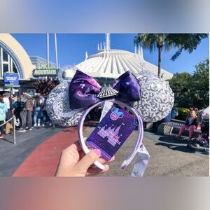 Main attraction series Minnie Mouse ears. Space mountain themed. Shimmering silver ears with a cosmic purple bow. Ideal for Disney enthusiasts. PRICE IS NEGOTIABLE
