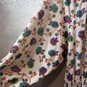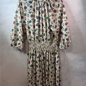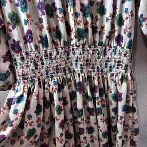 Chic floral maxi dress with a smocked waist. Features long sleeves and a flowy silhouette. Ideal for any occasion.