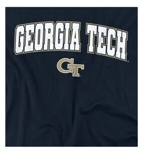 Georgia Tech Yellow Jackets short sleeve graphic tee showcases the iconic university wordmark in a bold arched collegiate font above the classic GT logo. Constructed from a comfortable cotton-blend fabric in a deep navy blue, this t-shirt offers a standard fit perfect for game days at Bobby Dodd Stadium or everyday campus wear. The screen-printed graphics feature a textured white and gold finish that stands out against the dark background.
