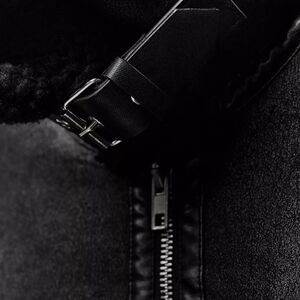 Biker jacket made of faux leather fabric with matching faux shearling lining. Loose-fitting lapel collar and long sleeves. Front pockets. Adjustable side tabs with metal buckle. Front fastening with metal zip.