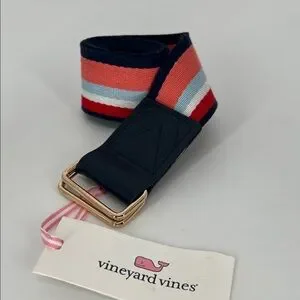 Stylish Vineyard Vines belt with bold stripes and cowhide trim. Features red, blue, and white colors. Ideal for adding flair to any outfit.