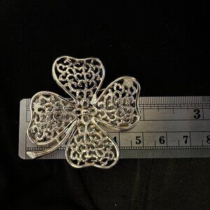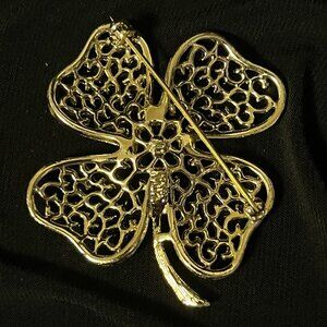 This charming Sarah Coventry four‑leaf clover brooch features the brand’s signature mid‑century filigree craftsmanship. The openwork clover design is delicate, airy, and beautifully detailed, catching the light through its lacy metalwork. It is stamped SARAH COV, confirming its authenticity as a true vintage Coventry piece.