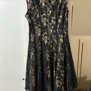 Chic midi dress with black lace overlay. Cream underlay adds contrast. Perfect for elegant events.