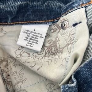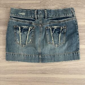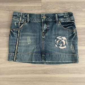 Stylish denim mini skirt. Features a white rose design. Classic blue color. Perfect for casual wear.