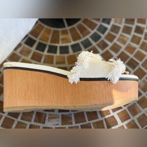 • Materials: The upper strap is made of frayed cotton fabric, and the platform wedge is crafted from wood.