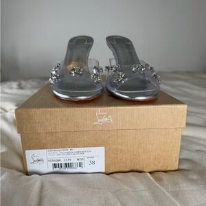 In very good condition Authentic Christian Louboutin Degrqueen 85 heels featuring clear PVC upper with silver crystal embellishments and signature red sole. A true statement shoe — elegant, modern, and perfect for special occasions, weddings, or evening events.