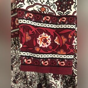 Beautiful Fall colors on this stretch poly/spandex blend dress. Mandala print in mainly a burgundy and white. Really pretty details and nice length. 3/4 sleeve.