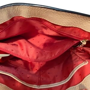 Kate Spade New York Dewitt Lane Sheila satchel in the brand’s Cashew colorway (a soft nude/blush pebbled leather) with embroidered floral and hummingbird motif on the front flap. Features both a structured top handle and the original Kate Spade removable adjustable crossbody strap, allowing it to be worn as a satchel, shoulder, or crossbody bag. Finished with signature red jacquard lining and a push-lock closure at the front flap.