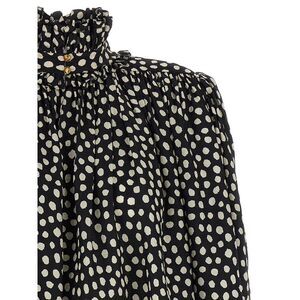 Crop top in silk jacquard with curled polka dot print, high neck with ruffles and front metal button closure, maxi padded shoulders, long wide sleeves with cuffs.