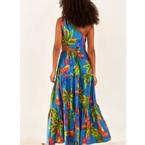 Farm Rio Sunny Day Maxi Dress One-Shoulder Cutout Tropical Linen Blend Size XL