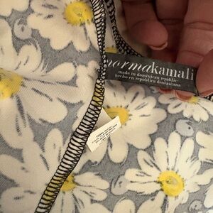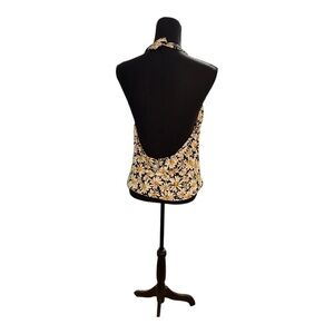 This sleeveless halter by Norma Kamali features a chic halter design with a fitted silhouette, showcasing a striking black and cream floral pattern. Size XL PP 17 Length 19. The elegant ties around the neck add a touch of sophistication, making it a perfect choice for a stylish summer outing.