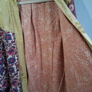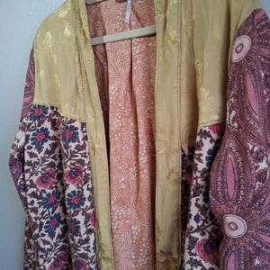 RARE Free People Maggie Floral Jacket Duster fully lined. In vibrant absolutely Gorgeous Purple Fuchsia Pink and Gold and blue with two large pockets on the front. The inside is lined with a pinky peach Floral pattern. Has a Magnolia Pearl Vibe to it.