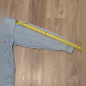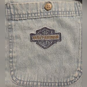 Classic blue denim shirt with button-up design. Features chest pockets and Harley-Davidson emblem.