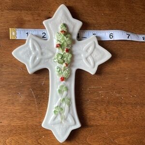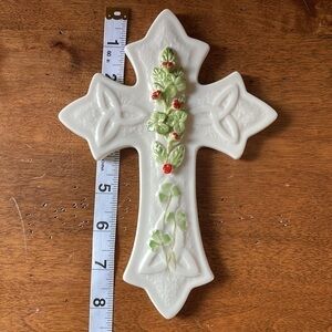 Belleek China (Ireland) Holy & Shamrock Flowered Cross NIB original packaging. 8” length x 6” wide. Irish Collectible wall hanging.