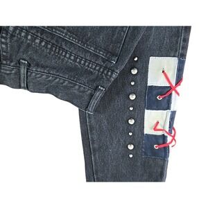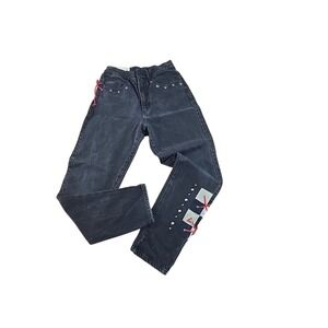 Discover unique style with these Tanner Marie black wash denim jeans. Eye-catching custom patchwork squares adorn the side leg, intricately laced with vibrant red ribbon, adding a playful and edgy touch. Subtle silver stud detailing lines the side seam, enhancing the denim's texture and adding a touch of shine. The classic five-pocket styling and comfortable fit make these jeans a versatile staple. Perfect for a casual day out or a unique evening ensemble.
