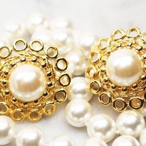 - Beautiful round faux pearl cabochons surrounded with three unique gold tone patterns