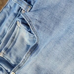 American Eagle "skinny" blue jeans with light distressing on the ankles. The jeans say skinny but the leg definitely fits more like a straight leg as it doesnt taper too much towards the ankle.