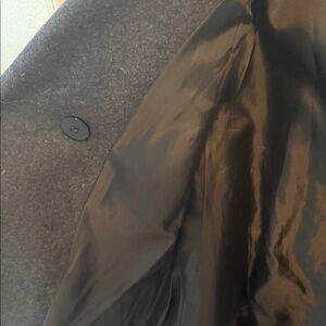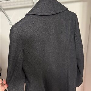 Chic charcoal pea coat with double-breasted design. Features buttoned front and side pockets.