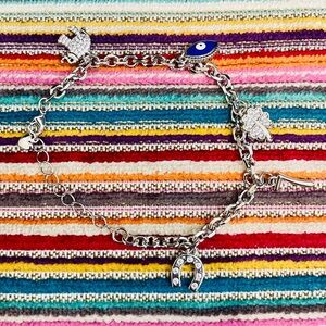 Vintage style, cute white gold charm bracelet featuring an enamel evil eye and other lucky symbols, such as shamrock/4-leaf clover, lucky 7, horseshoe, and elephant. Goes with everything!