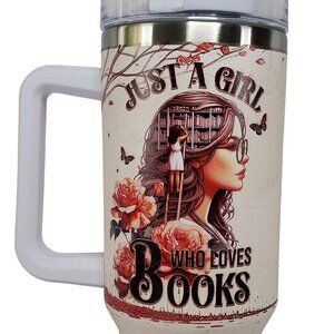 Just A Girl Who Loves Books Travel Tumbler 40 Oz Handle & Lid Book Worm Gift
