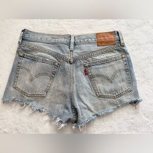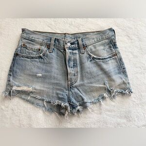 Classic Levi’s 501 denim shorts in a beautiful light wash with distressed details and raw frayed hem.