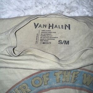 Celebrate rock history with this Van Halen 'Tour of the World 1984' beige t-shirt. Perfect for music enthusiasts, this short sleeve tee offers comfort and style.