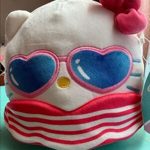 Charming Hello Kitty plush with heart-shaped sunglasses. Features a cute bow and red and white striped swimsuit Ideal for fans of cuddly toys.