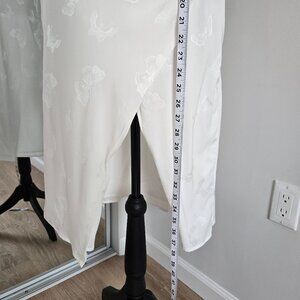 The Wishing on Love dress by Lulus features white satin jacquard fabric with an embossed butterfly pattern woven throughout. The fabric has a soft sheen with light structure. Designed with adjustable tie shoulder straps and a sweetheart neckline with seamed cups for shape. The fitted waist has subtle gathering before flowing into an overlapping tulip-style midi skirt. Smocking at the back allows flexibility, finished with a hidden zipper and clasp.