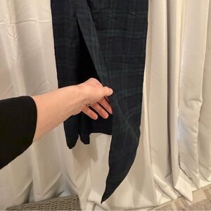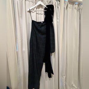 I bought thinking it’d be cute for a Christmas party or family photos but my size has changed postpartum and only wore it once without the bow attachment. Like new without tags, has a pretty slit (see photos) and very soft material. Easy to remove or wear bow. Bow is black velvet.