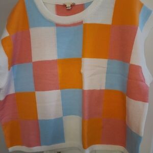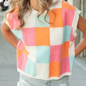 Vibrant checkered sweater by BiBi. Features bold orange, blue, pink, and white squares. Crew neck design. Perfect for a stylish look.