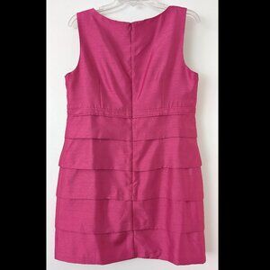 Sleevless deep pink above-the-knee, fully lined sheath dress. Fitted dress has tiered layers for a flattering look with small bow detail at waist. Great for events, a cocktail party, or a wedding guest. In great pre-owned condition.