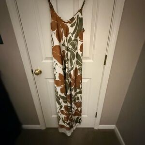 Steal the show with this elegant floral patterned spaghetti strap maxi dress Featuring rich green and brown hues, the silky fabric is lightweight and perfect for a tropical vacation or summer evening out .