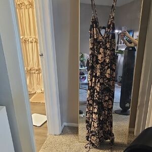 Elegant pink maxi dress with floral pattern. Features lace detailing and flowing design. Perfect for any occasion.
