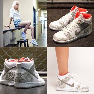 Part of the 2012 Nike Womens Dunk High Skinny “Leopard Pack”, the Nike Dunk High Skinny in White/Grey is a slender, feminine, stylish take on the basketball classic. A white base is offset by leopard motif on the front and back panels, and sunburst coloring on the inner lining, while the high-top silhouette provides ample support and style. Leather upper, rubber sole. EUC: bought new + only worn occasionally. Some VERY minor signs of wear - no stains or damages I can find. Thoroughly cleaned, smoke-free home. Respectful offers welcome. Note: since this is such a rare, discontinued model, some are going for $400+ online! *pics 1-4 stock