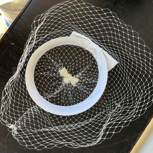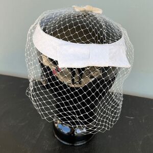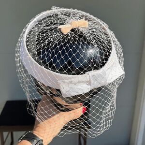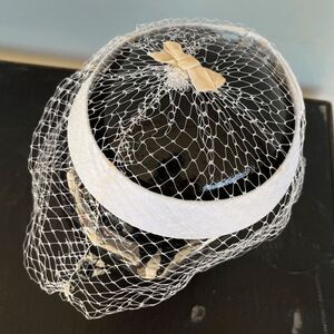 This elegant vintage white fascinator features a charming bow accent and a soft mesh veil. The delicate netting drapes beautifully over the face, adding a touch of timeless sophistication to your ensemble. Perfect for bridal events, vintage-themed parties, or any occasion that calls for a dash of retro glam. The white band is lightweight and comfortable for extended wear. This item is from Nany's Closet Estate and was in a hat box marked "Brides Maids Hats." Shop my closet for more like this.