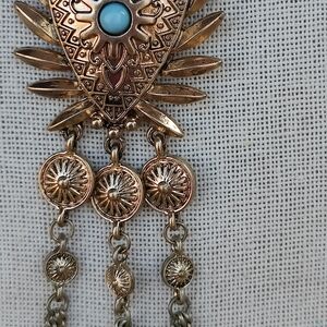 Bohemian gold necklace with blue accents. Unique design with intricate details.