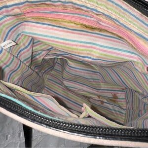 Darling pastel striped purse with black leather trim and silver hardware, has definitely seen better days! Super sturdy, interior is heavily stained. Stripes of hot pink, bay pink, baby blue, yellow, green, cream, and a light coffee brown color.