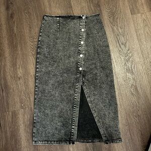 Upgrade your style with this elegant black denim pencil skirt. Featuring a sleek button-down design, it's perfect for any occasion. The size is a large, but fits more like a medium. This skirt is a good staple to have in your closet and can be dressed up! Very trendy!