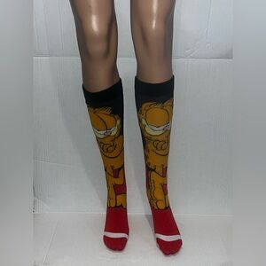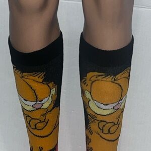 Enjoy the playful design of these Garfield cartoon socks. Featuring a striking black and orange color scheme, they add a fun touch to your wardrobe.