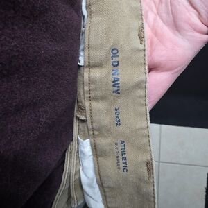 Men's casual dress pants from Old Navy. Athletic fit means they're looser/more flexible through the hips and thighs which makes these suited for women to wear too. Gently worn with no flaws such as stains or tears. Four pockets. Zipper/button closure.