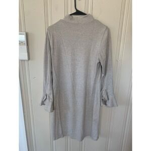 Metallic Silver Mock Neck Shift Dress Long Sleeve Ruffle Cuff Sparkle Knit