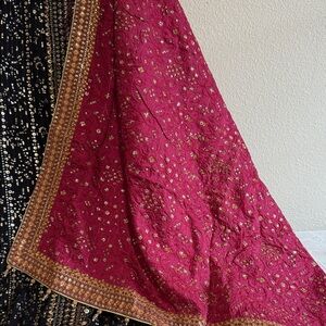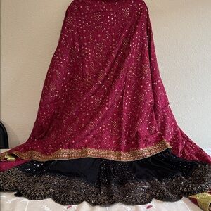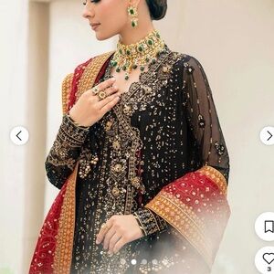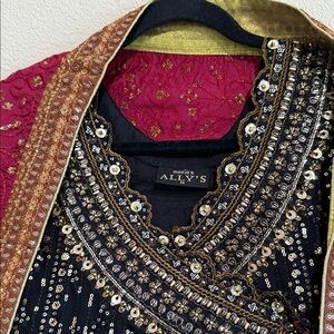 This beautiful 3 piece Aly’s chiffon collection features an angrakha style long dress with dori embellishment on the front. It has thread work and sequence embellishments throughout, finished with full length embroidered sleeves. It comes with crushed plazo and an embroidered Maroon silk dupatta.